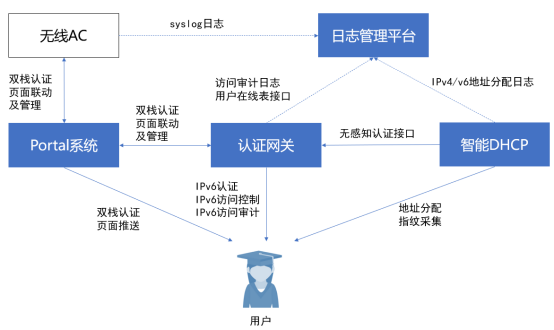 重庆大学本次部署的IPv6安全运营支撑系统,不仅限于认证环节,而是贯穿于实名用户从地址分配、接入认证到日志审计的全环节,涉及IPv6地址分配管理、认证计费网关、日志管理和portal认证服务。