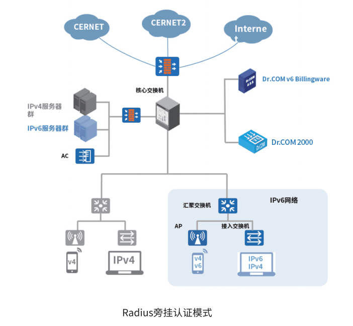 配合Dr.COM智能DHCP系统*,可实现终端DHCPv6和无状态地址自动配置环境下的无感知认证,解决IPv6地址变化带来的接入体验问题。